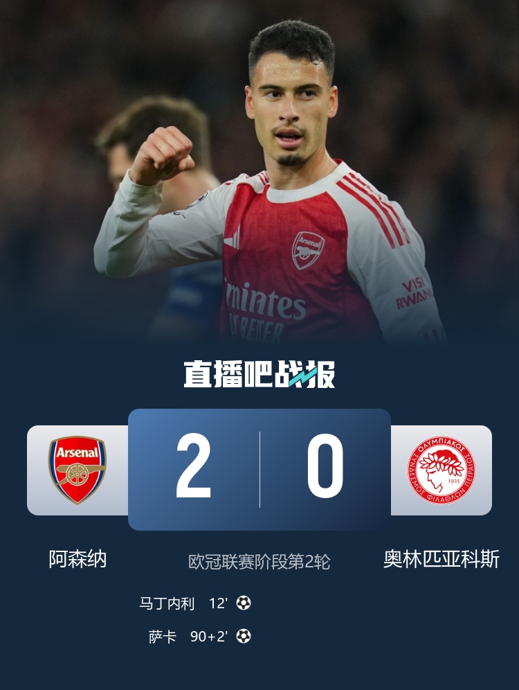 10月2日讯 北京时间10月2日凌晨3时,欧冠小组赛第2轮,阿森纳在酋长球场迎战奥林匹亚科斯。比赛上半场,马丁内利首开纪录,拉亚则有精彩的扑救。阿森纳以1-0领先结束上半场。下半场,加布里埃尔受伤离场,波登斯的进球因越位被判无效,替补出场的萨卡则为球队再添一分。最终,阿森纳以2-0战胜对手,取得欧冠连胜。