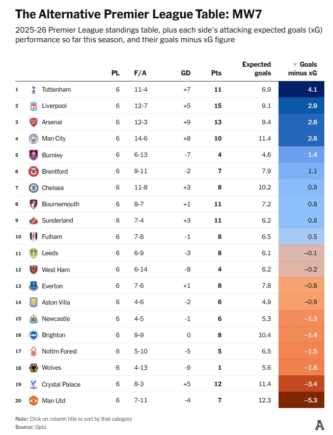 在英超的预期进球与实际进球的比较中,热刺是表现最佳的球队,其实际进球超出预期达4.1球,排名第二的利物浦也有2.9球的优势,紧随其后的是阿森纳和曼城,各自超出预期进球2.6球。这些数据反映了各支球队在把握机会和进攻效率上的不同,显示出曼联在进攻端亟需提高的迫切性。