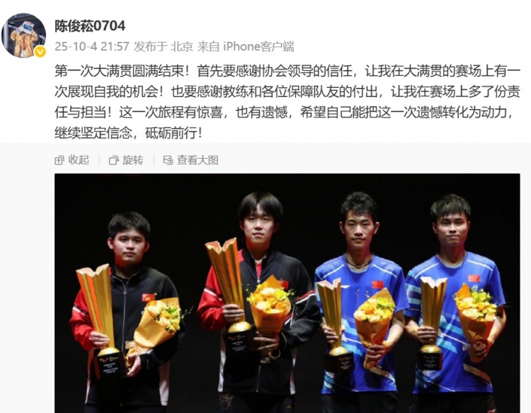 10月4日,中华乒坛的陈俊崧在他的社交媒体上发声,似乎是在庆祝他在本届WTT中国大满贯的“辉煌”表现。陈某不仅感谢了乒协领导的信任,仿佛在说:“谢谢你们让我在大满贯的舞台上展现自我”,同时,他也不忘提到教练与“保障队友”的辛苦付出,听起来就像是在给那些背后默默无闻的人颁发了个参与奖。