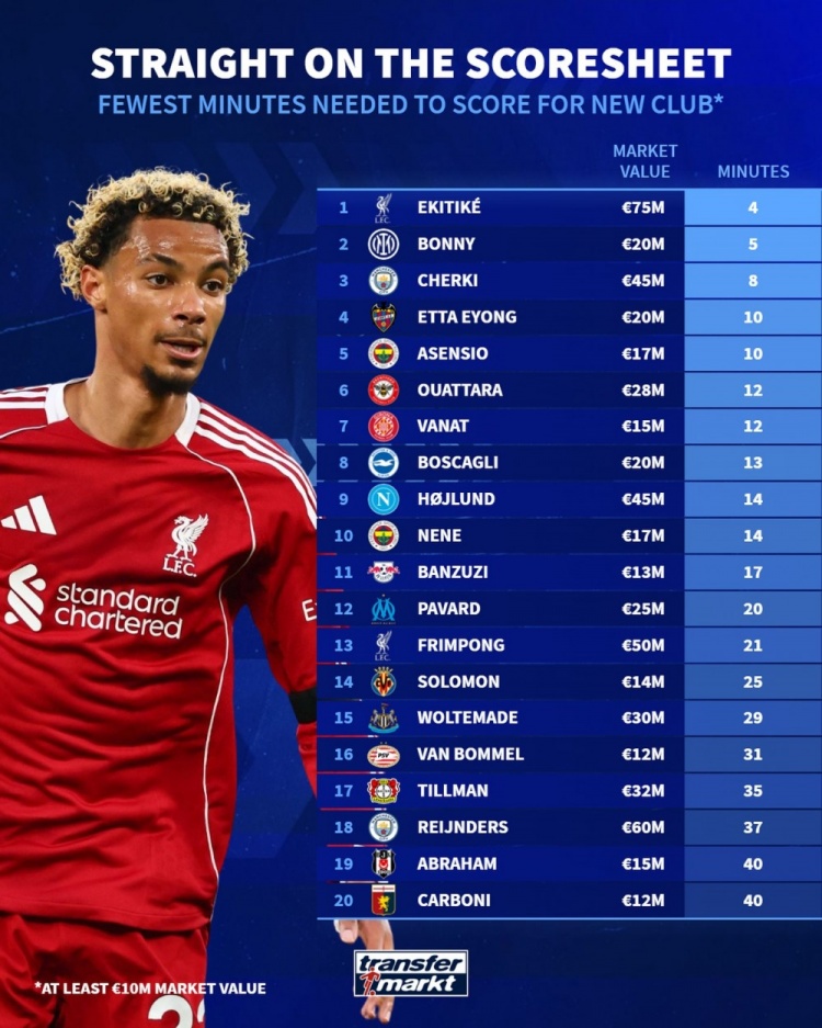 10月8日讯 优秀的夏季转会市场上,各支球队都在积极引援,而新加盟球员在首场比赛中打入处子球的表现也备受关注。根据统计,这个夏天,埃基蒂克在利物浦的首秀中展现出了惊人的天赋,仅用4分钟就打入了他的首个进球,成为最快处子球的球员。