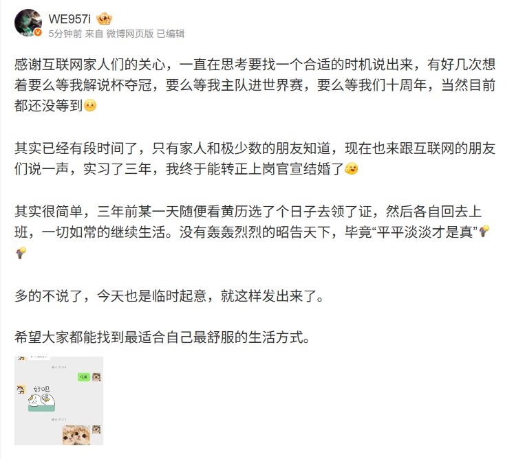 事实上,957与爱人早已于三年前便默默领取了结婚证,只有家人和少数挚友知情。如今,他终于决定与大家分享这段经历。他回忆起当年,自己是在某个平常的日子里,随意查询黄历挑选了一个吉日,然后简单地完成了结婚手续,接着便如往常一样回到工作和生活中。没有盛大的宣布,正如他所说:“平平淡淡才是真。”