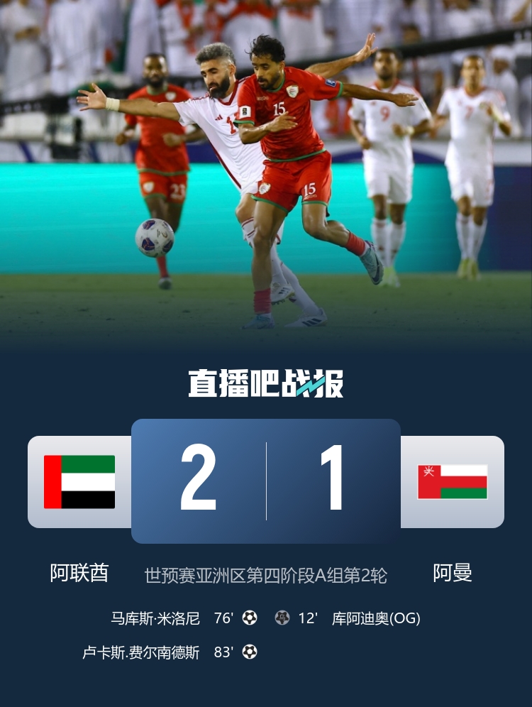 在那令人屏息的夜晚,世预赛亚洲区的舞台上,阿联酋与阿曼的较量如火如荼。时间指向北京时间10月12日清晨1点15分,众人聚焦于这一场紧张的对决。上半场,场上风云突变,库阿迪奥的乌龙球为阿曼带来了意外的首开纪录,阿联酋在家门口面临了严峻的挑战,比分悄然变为0-1。