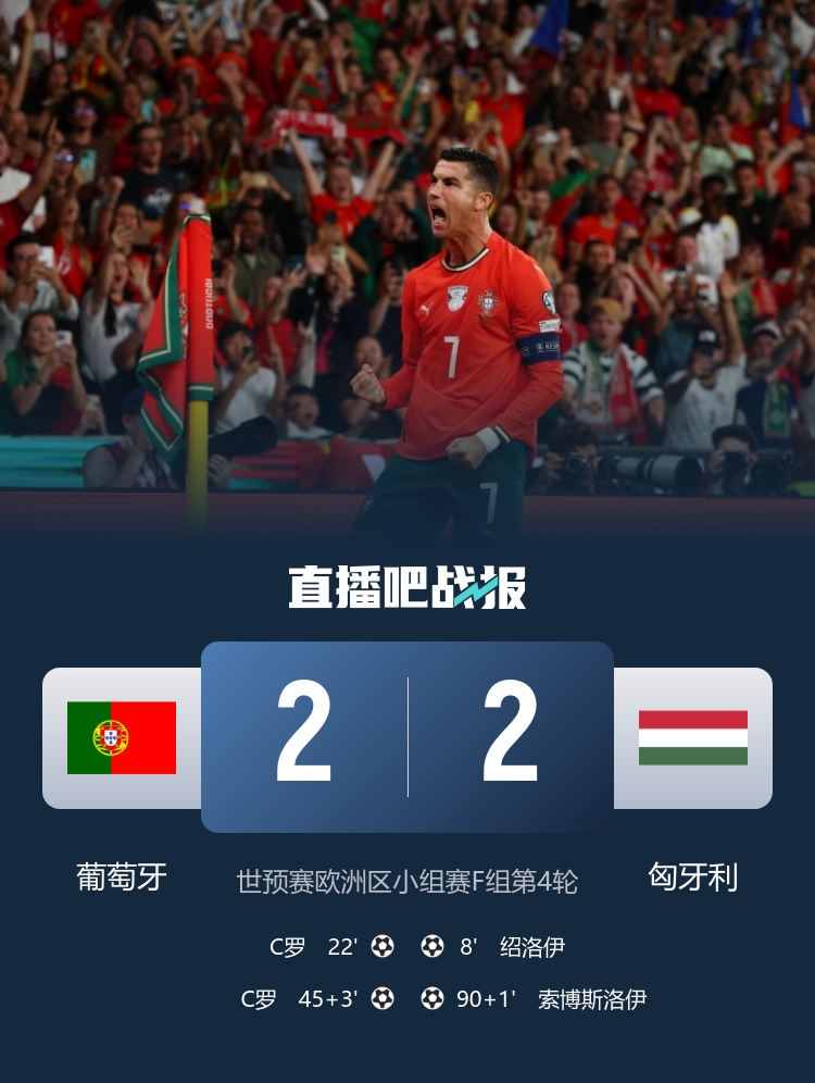 然而,比赛的悬念在最后时刻被重新点燃。第90+1分钟,匈牙利在右路发动反击,卢卡奇的传中球让索博斯洛伊成功将球铲入网中,将比分定格在2-2,实现了绝平。虽然葡萄牙在回忆起C罗再次闪耀的同时,也不得不面对未能提前晋级世界杯的遗憾,四轮过后以10分位列小组第二,匈牙利则以5分紧随其后。
