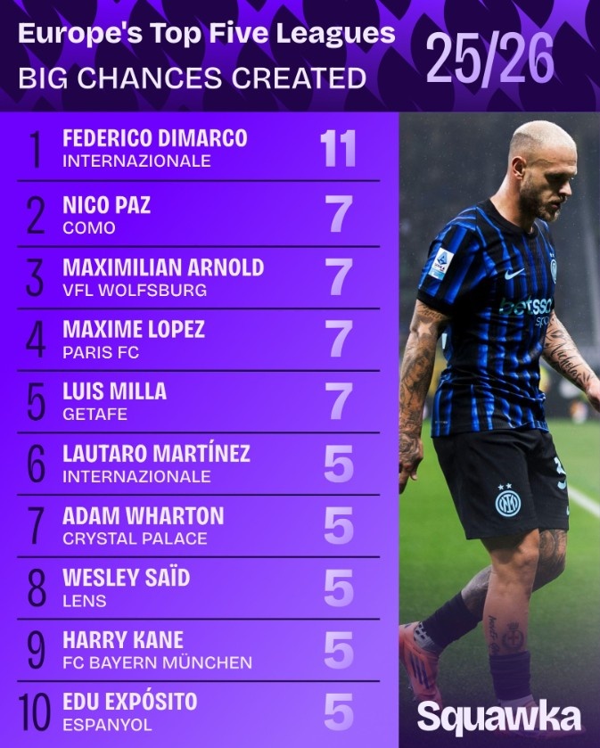 本周末,欧洲五大联赛即将展开激烈角逐。根据Squawka的统计,本赛季至今在五大联赛中创造重大进攻机会方面表现最为突出的是国米的迪马尔科,他以11次的成绩独占鳌头。紧随其后的是科莫的尼科-帕斯、沃尔夫斯堡的马克西米利安-阿诺德、巴黎FC的马克西姆-洛佩斯及赫塔费的路易斯-米拉,四名球员均以7次的成绩紧跟其后。