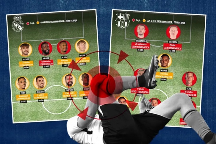 10月25日讯 据《马卡报》报道,皇马和巴萨两队共有多达16名球员受到不同程度的身体问题影响。在这之中,皇马的吕迪格和阿拉巴,以及巴萨的特尔施特根、加维、莱万、奥尔莫、拉菲尼亚和霍安-加西亚八名球员已经确认将缺席即将在伯纳乌举行的对决。