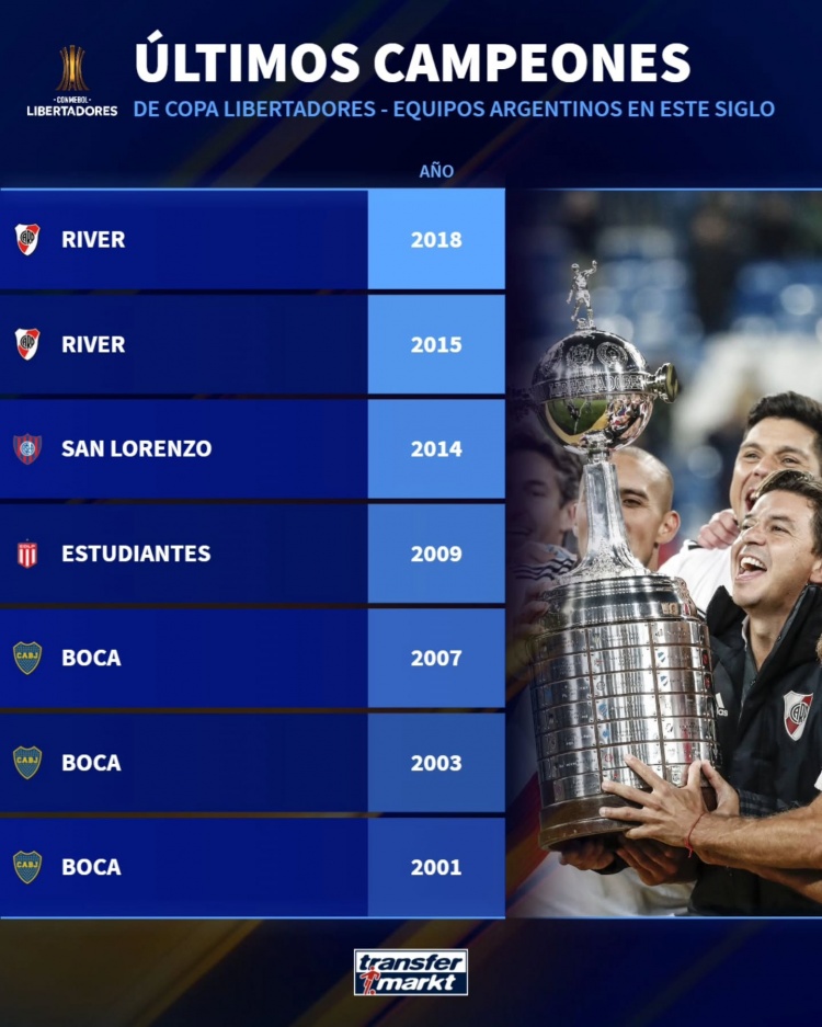 回顾过去的岁月,从2001年博卡青年第一次夺得冠军开始,这个时代的辉煌似乎已经成为历史。2003年,博卡再次展现了他们的王者风范,而在2007年,他们又一次捆绑了这个荣誉。2009年时,拉普拉塔大学生也在此届赛事中实现了自己的夺冠梦,紧接着是2014年圣洛伦索的胜利及2015年河床的加冕,直至2018年河床再次把奖杯收入囊中。