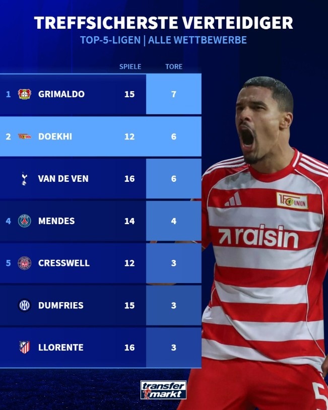 11月11日讯,欧洲五大联赛这块热土,竟然也能见到一些如同刀尖上舞蹈的后卫,像格里马尔多和多克希这样的球员,简直让人刮目相看。德国转会市场有心统计了本赛季五大联赛中进球最多的后卫,说到这里,你可能会想,后卫不就是专门防守的嘛?怎么还跑去和前锋争进球呢?看起来将会给天真无邪的足球观众上演一出频频“反向操作”的戏码。