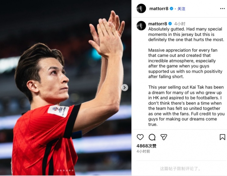 在他的文字中,安永佳毫不掩饰自己心中的失落。他提到,为中国香港队奋斗的过程中经历了许多特别的时刻,但如今面对无缘亚洲杯的结局,心中难免感到伤感。他特别感谢了那些亲临现场的球迷们,正是他们在球队落后的时候,依然给予热情的支持,鼓舞着球队继续前行。即便在最终的失利中,他们的鼓励依然令人铭记。