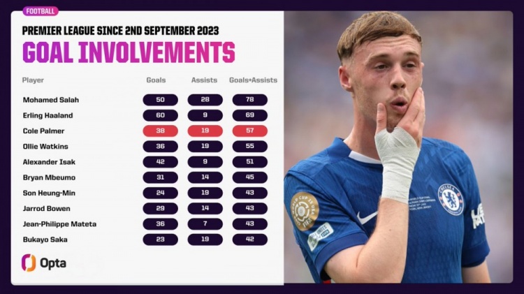 3. 科尔·帕尔默以38个进球和19次助攻,累计直接参与57个进球,意外成为切尔西进攻上不可或缺的一员。