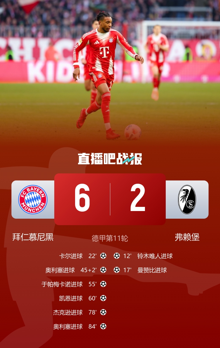 在11月22日进行的德甲联赛第11轮中,拜仁慕尼黑在主场以6-2大胜弗赖堡,为自己在积分榜上的领先地位打下了坚实基础。比赛开局不利,拜仁在角球防守上出现漏洞,铃木唯人和曼赞比分别利用这一机会为弗赖堡攻入两球,一时间弗赖堡以2-0领先。