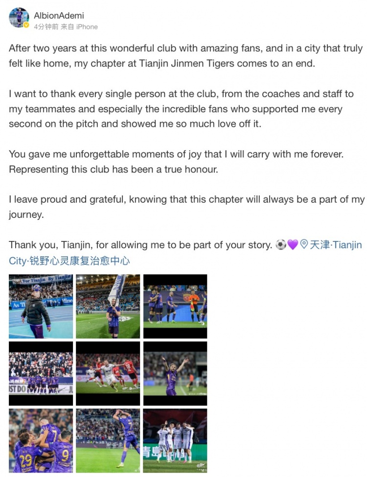 在他的告别信中,阿代米回顾了自己在津门虎的两年时光,表示在这支出色的球队和热情的城市里,他不仅享受到了足球的乐趣,还感受到了一种家的归属感。他感谢球队的教练、工作人员和队友们,特别提到球迷们的支持,让他在比赛中感受到无比的热情与爱意。