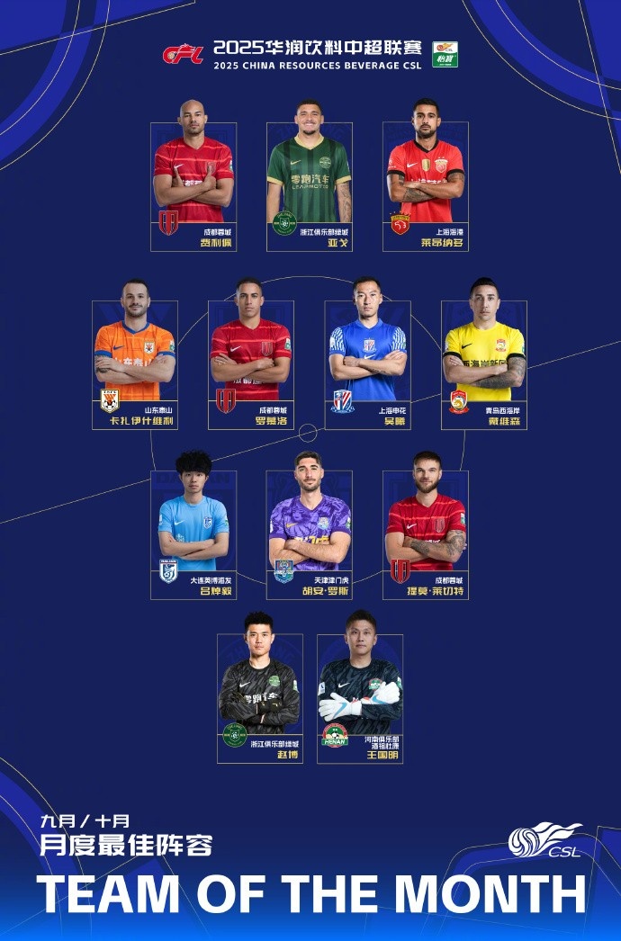 中超联赛在11月27日正式公布了9月和10月的最佳阵容,此次评选采用了343阵型,成都蓉城有三名球员入选,门将位置则出现了两位表现出色的候选者。