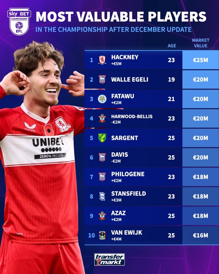 根据最新的转会市场资讯,英冠联赛的一系列球员身价也进行了相应的更新。当前,米德尔斯堡的希顿·赫根尼以惊人的2500万欧元位居身价榜首,显示出他在市场上的重要价值和潜力。