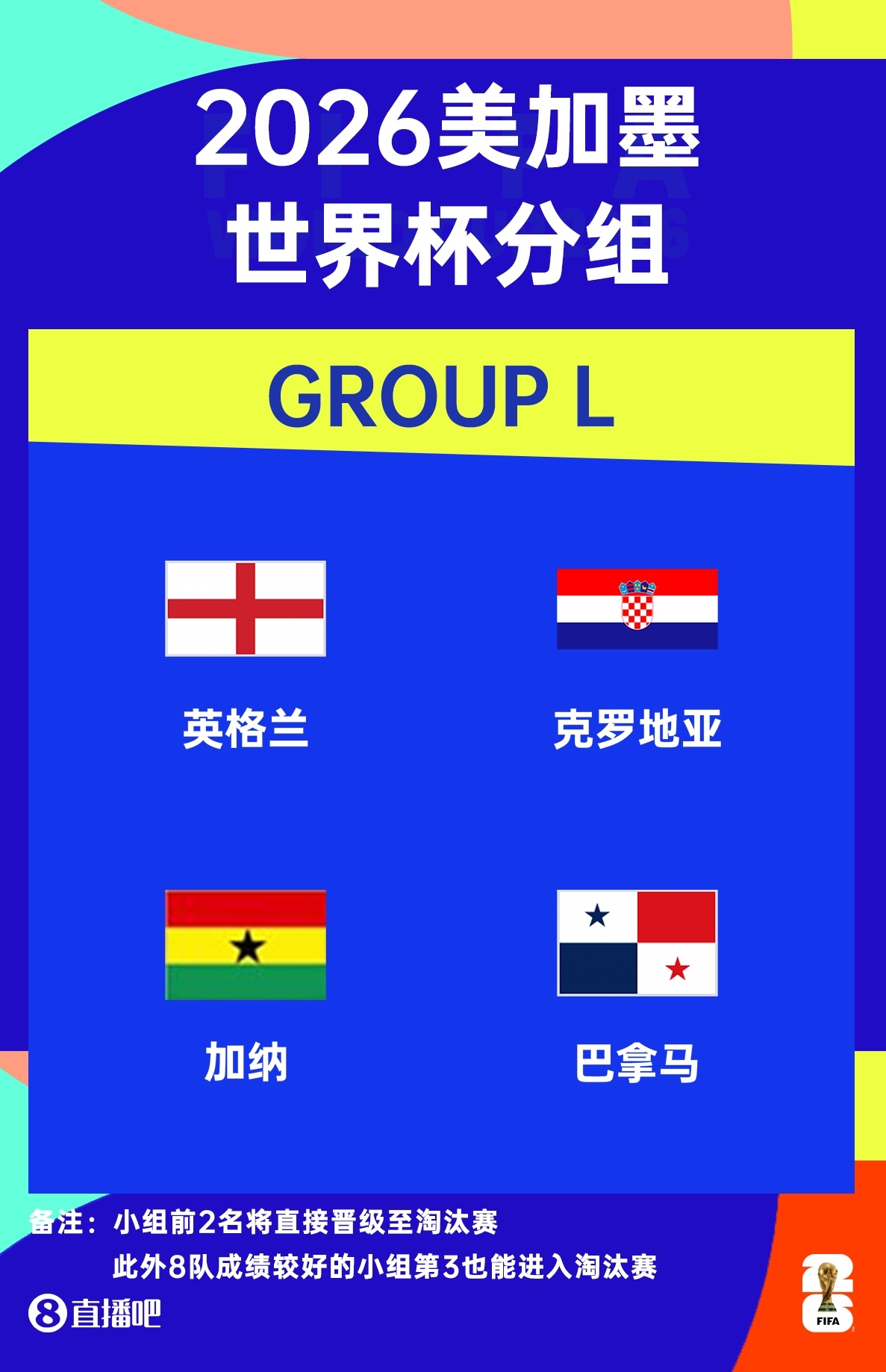 2026年美加墨世界杯小组赛抽签结果已于12月6日揭晓,L组的参赛球队确定为:英格兰、克罗地亚、加纳和巴拿马。