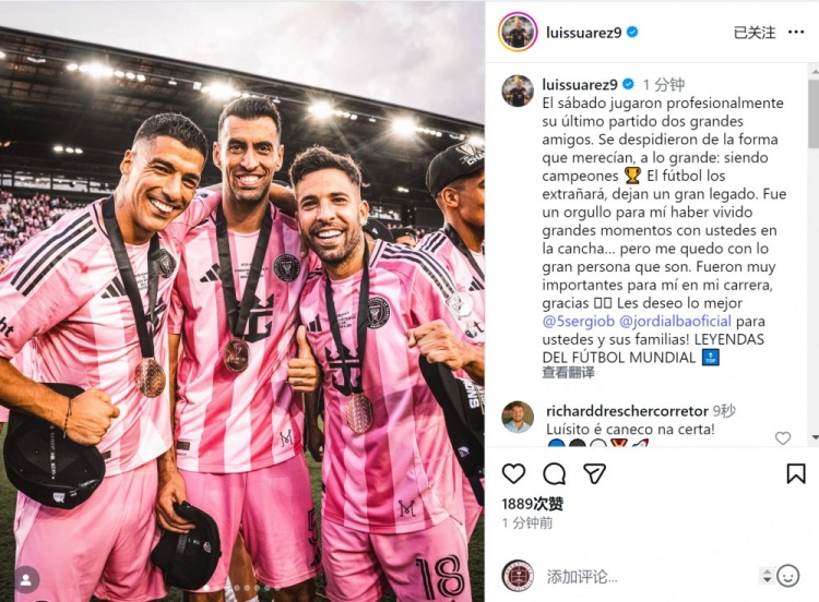 苏亚雷斯在社交平台上分享了与阿尔巴和布斯克茨的合影,并写道:“上周六,我的两位挚友完成了他们职业生涯的最后一战,他们以应有的方式告别——拿下了冠军奖杯?。足球界将永远怀念他们,他们留下了伟大的‘遗产’。”