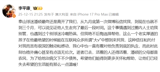 12月15日讯,山东球迷潘硕不幸离世,令人痛心。媒体人李平康对此事表达了深切的哀悼,并分享了与潘硕的交往经历。
