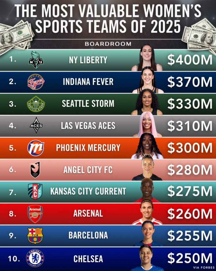 在榜单的前十名中,除了纽约自由人以外,印第安纳狂热、西雅图风暴、拉斯维加斯王牌和菲尼克斯水星也紧随其后,进一步证明了WNBA在支撑女子体育价值方面的领导地位。而在NWSL中,天使城女足和堪萨斯城女足也跻身前十名,显示出女子足球的强劲势头。此外,英女超的阿森纳、巴塞罗那和切尔西等球队的表现也亮眼,彰显了各类女子体育团队日益增加的市场价值和影响力。