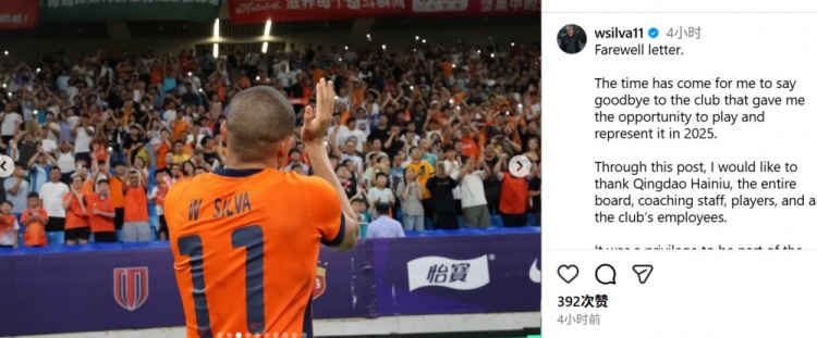 12月28日的消息,韦林顿·席尔瓦在社交媒体上向青岛海牛俱乐部以及球迷们表达了他的告别之情。