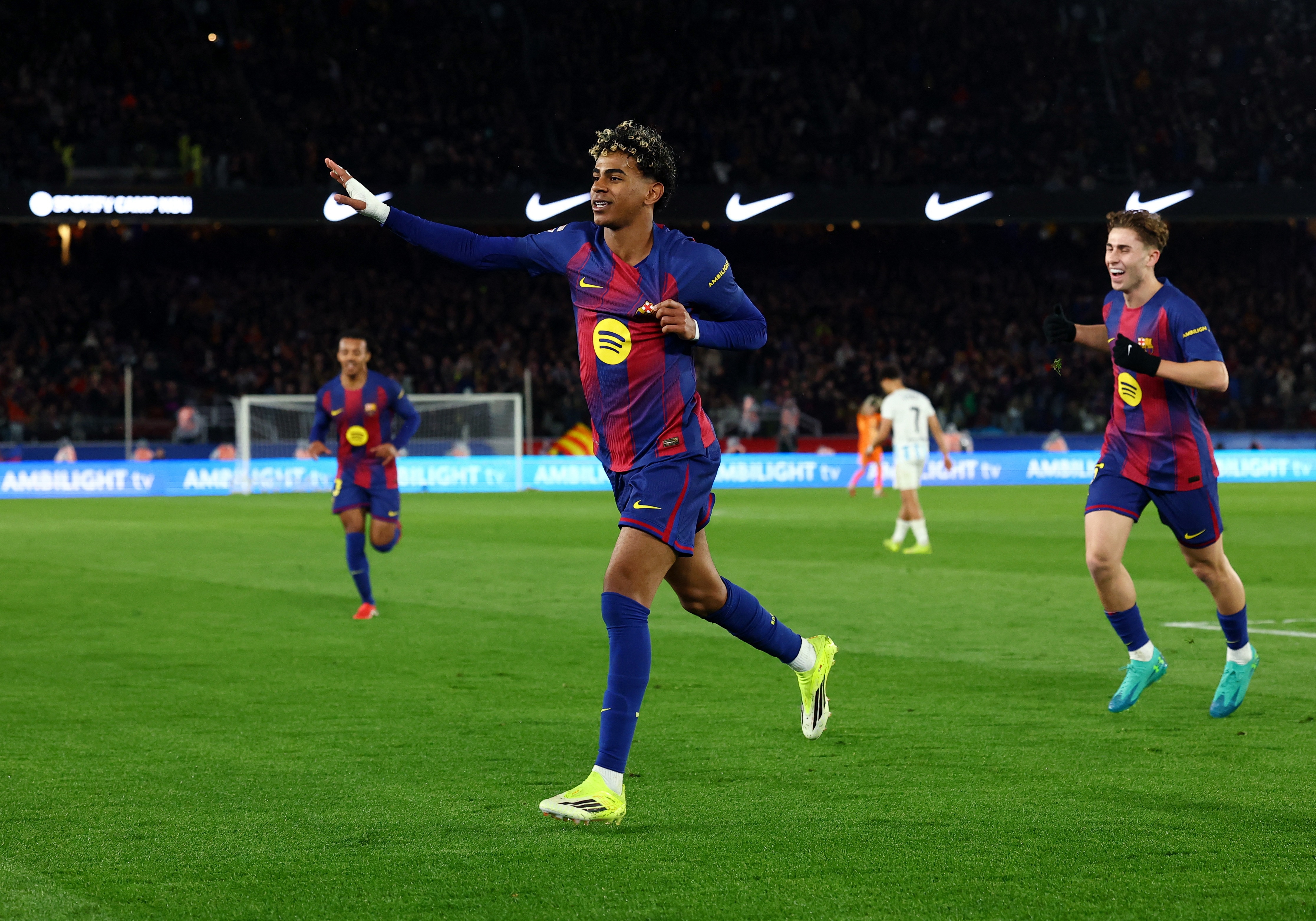 比赛中的另一个亮点则是亚马尔的特别庆祝方式。在打进一记精彩的倒钩射门后,他没有选择常规的庆祝方式,而是走到广告牌前坐下,双手叉腰,并露出灿烂的笑容,享受这个属于自己的时刻。这一幕引起了队友们的阵阵笑声,令人印象深刻的则是亚马尔的这一独特个性表达,在过去的欧洲杯中,他曾经也有过类似的庆祝方式。