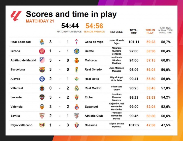 不远处,巴萨在对奥维耶多的比赛中以3-0大胜,然而在95分钟6秒的总时长内,净时间也仅有56分4秒,让人不禁感叹比赛的节奏。在阿拉维斯与贝蒂斯的较量中,尽管阿拉维斯以2-1小胜,总时长99分41秒的背景下,净时间也只有55分50秒。比利亚雷亚尔在对抗皇马之时,净时间为55分45秒,而这场比赛的总时长为96分钟25秒。