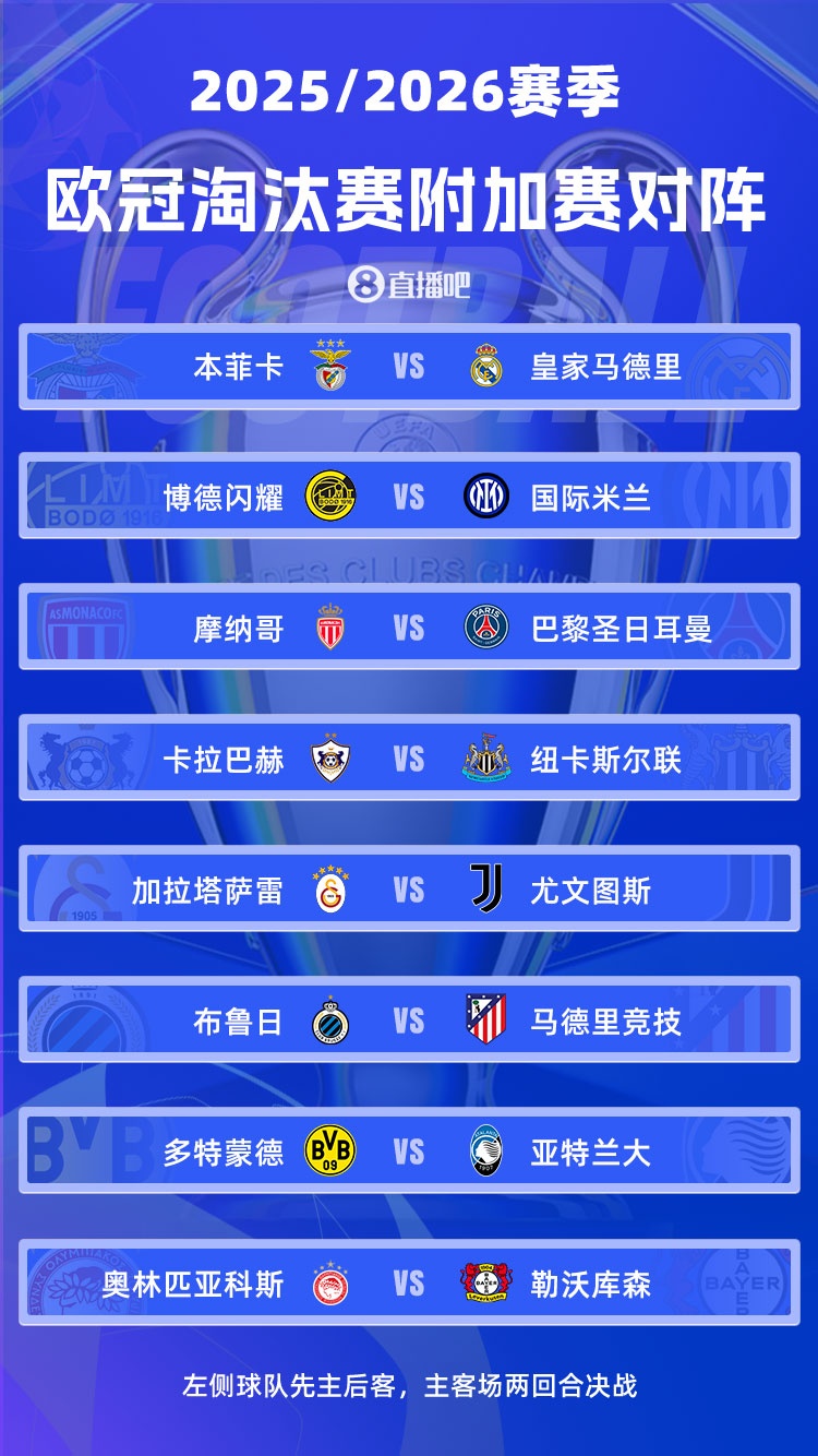 2025-26赛季欧冠淘汰赛附加赛的抽签结果已正式公布,本菲卡将在本次赛事中迎战皇家马德里,穆里尼奥再度面对老东家。而法甲内部的焦点战则是摩纳哥与巴黎圣日耳曼的交锋。此外,国际米兰将挑战博德闪耀,尤文图斯则对阵加拉塔萨雷。