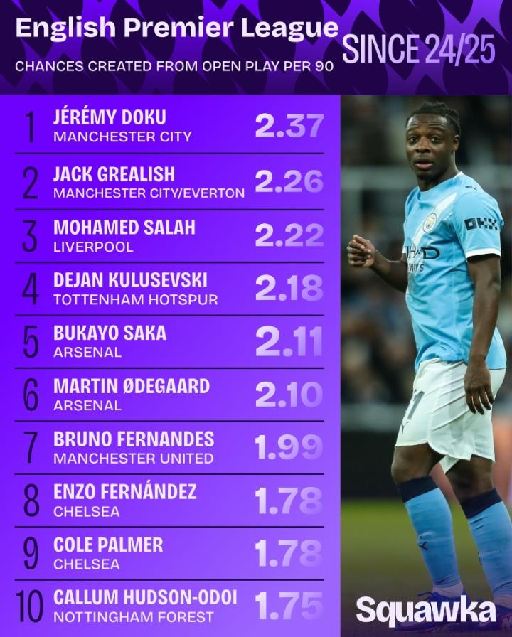 在这片绿茵场上,足球如诗如画,时时激荡着人心,风云变化的英超赛场更是涌现出了一批杰出的个人才能。根据“Squawka”的统计自上赛季开始至今,在每90分钟内创造运动战机会的英超球员中,有一位曼城的年轻边锋以其卓越的表现遥遥领先,成为了这个数据榜单的领跑者。他便是多库,场均创造2.37次机会,仿佛是一位舞者,在绿茵上写下了一串绚丽的音符。
