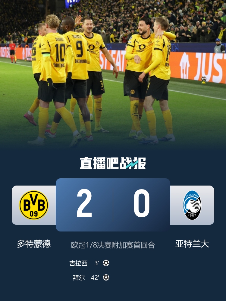 北京时间2月18日凌晨,多特蒙德在欧冠1/8决赛附加赛首回合的赛事中迎来了亚特兰大的挑战。比赛在伊杜纳信号公园球场进行,尽管开球时间略有推迟,但现场氛围热烈。上半场比赛中,多特蒙德的表现颇为亮眼,两位球员的精彩发挥帮助球队建立了领先优势。