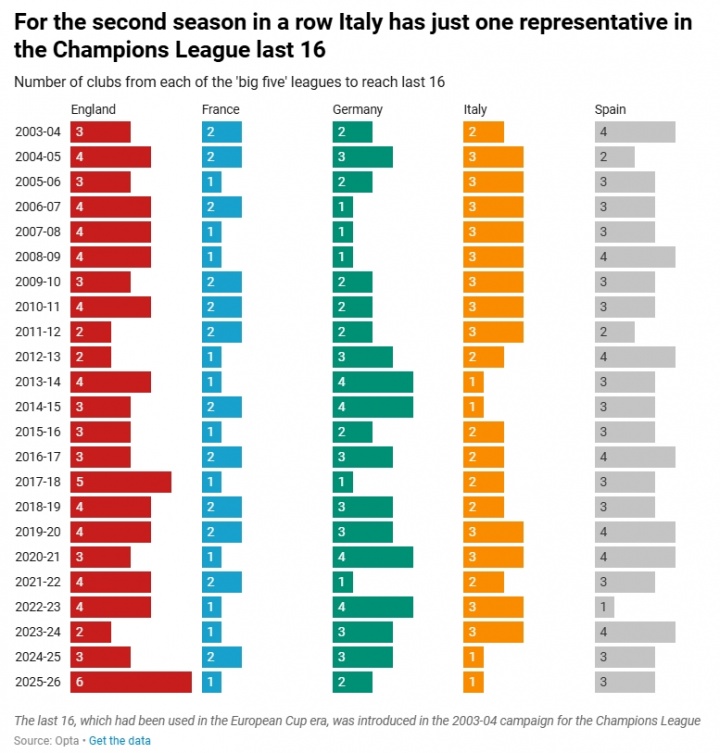 回顾历史,从03/04赛季起,英超几乎垄断了晋级名额,多年来最高曾达到5支球队,西甲也是步步紧逼,实时显现出西班牙足球的王者风范。反观意甲,似乎只有在梦游的时候才能勉强掩饰自己的无能:近两个赛季各仅有一支球队能够跻身16强,简直是足球历史上的一大耻辱。