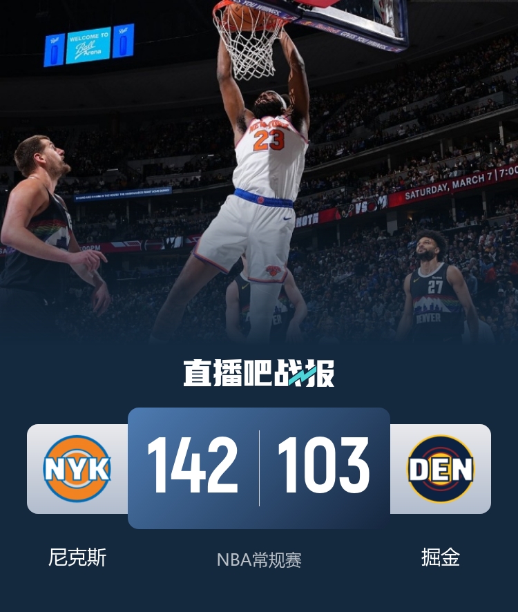 3月7日讯 在NBA常规赛中,掘金队在主场迎战尼克斯队。掘金以39胜24负的战绩排名西部第五,而尼克斯则以40胜23负位居东部第三。本场比赛中,阿隆·戈登复出并在首发阵容中亮相。