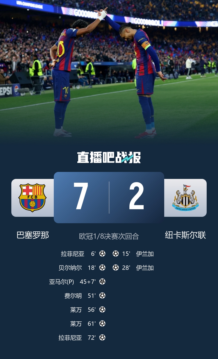 下半场,巴萨的进攻火力全开,拉菲尼亚不仅自己进球,还有两次助攻,而费尔明也加入了进球行列,莱万则展现出锋线老将的风范,打入了两球。最终,巴萨以7-2的悬殊比分战胜纽卡斯尔联,凭借总比分8-3成功晋级八强,接下来将迎战热刺与马竞的胜者。