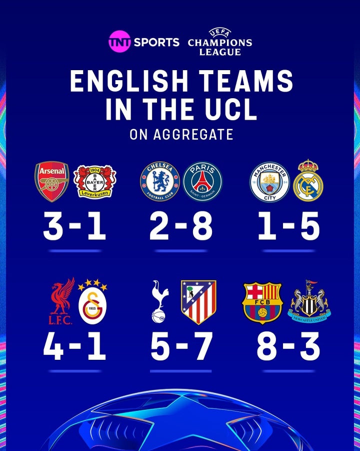 其余四支英超球队的表现相形见绌,纷纷止步于本轮,且大多以惨重的比分告负。曼城在对阵皇马时以1-5落败,结果令人失望;切尔西则在与巴黎的较量中以2-8被横扫,显示出明显的竞争力不足;纽卡斯尔在对巴萨时同样承受重创,以3-8告负。尽管热刺在本轮的比赛中战胜对手取得胜利,稍微挽回了面子,但以总比分5-7不敌马德里竞技,仍旧无奈挥别欧冠舞台。