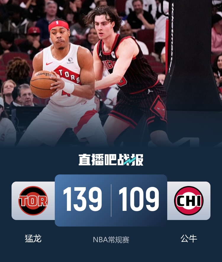 在3月19日的NBA常规赛中,多伦多猛龙队在客场以139-109大胜芝加哥公牛队。此役前,猛龙以38胜29负的战绩位列东部第五,而公牛则以28胜40负的战绩排在东部第十二。